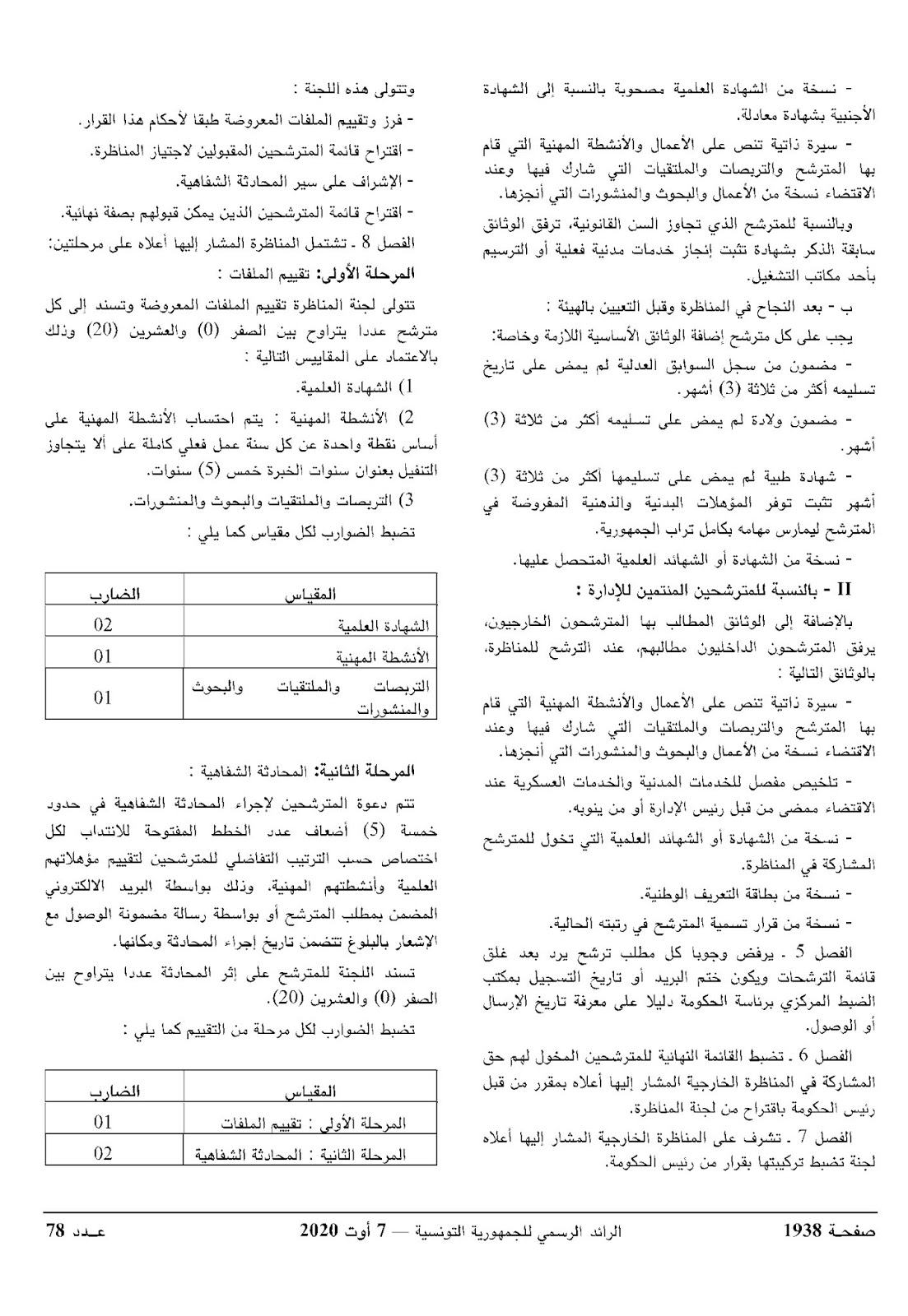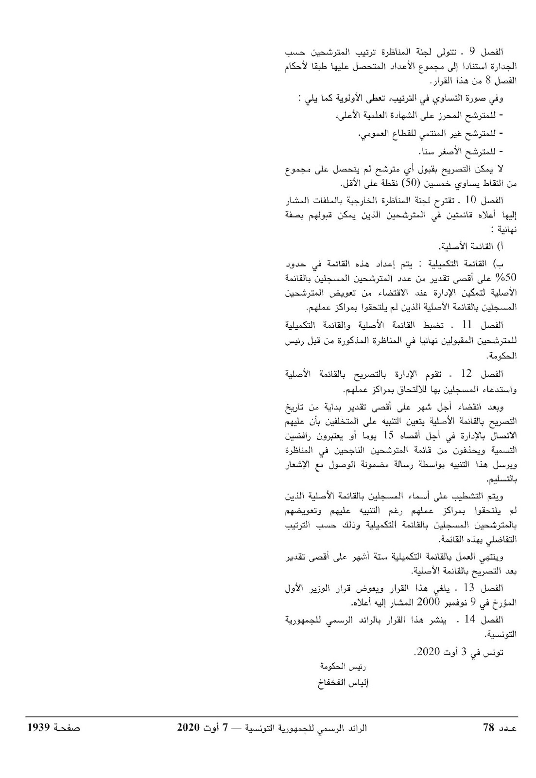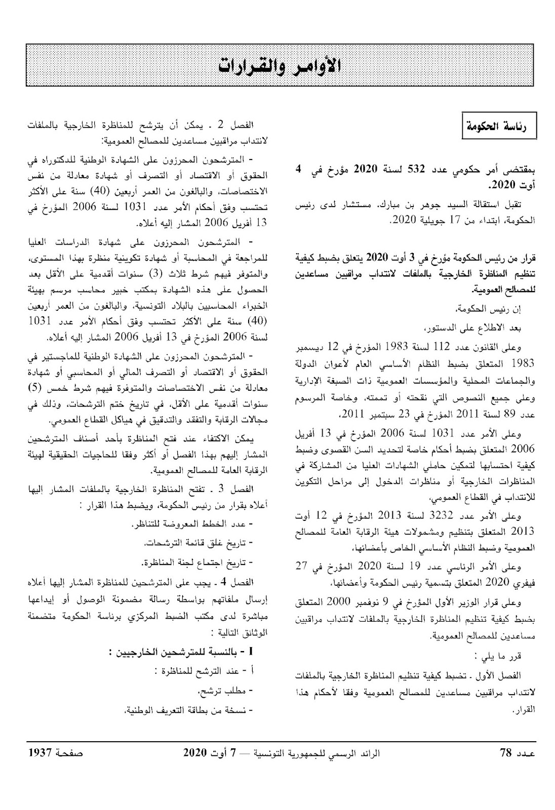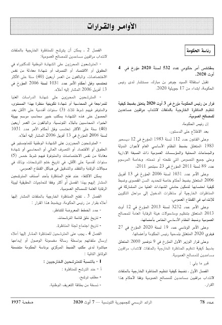 قرار من رئيس الحكومة مؤرخ في 27 أوت 2020 يتعلق بفتح مناظرة خارجية بالملفات لانتداب مراقبين مساعدين للمصالح العمومية