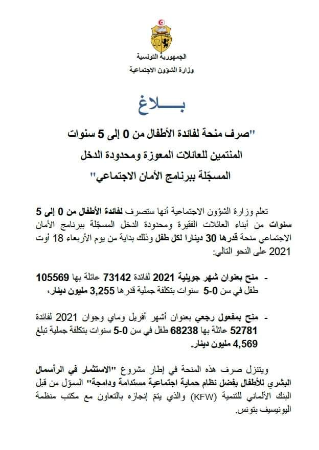 تعلم وزارة الشؤون الاجتماعية أنها ستصرف لفائدة الأطفال من 0 إلى 5 سنوات من أبناء العائلات الفقيرة ومحدودة الدخل المسجّلة ببرنامج الأمان الاجتماعي منحة قدرها 30 دينارا لكل طفل وذلك بداية من يوم الأربعاء 18 أوت 2021 على النحو التالي: