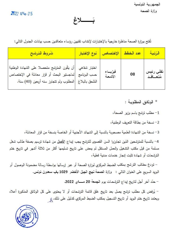 مناظرة وزارة الصحة لإنتداب عديد الأعوان بعنوان شهر ماي 2022