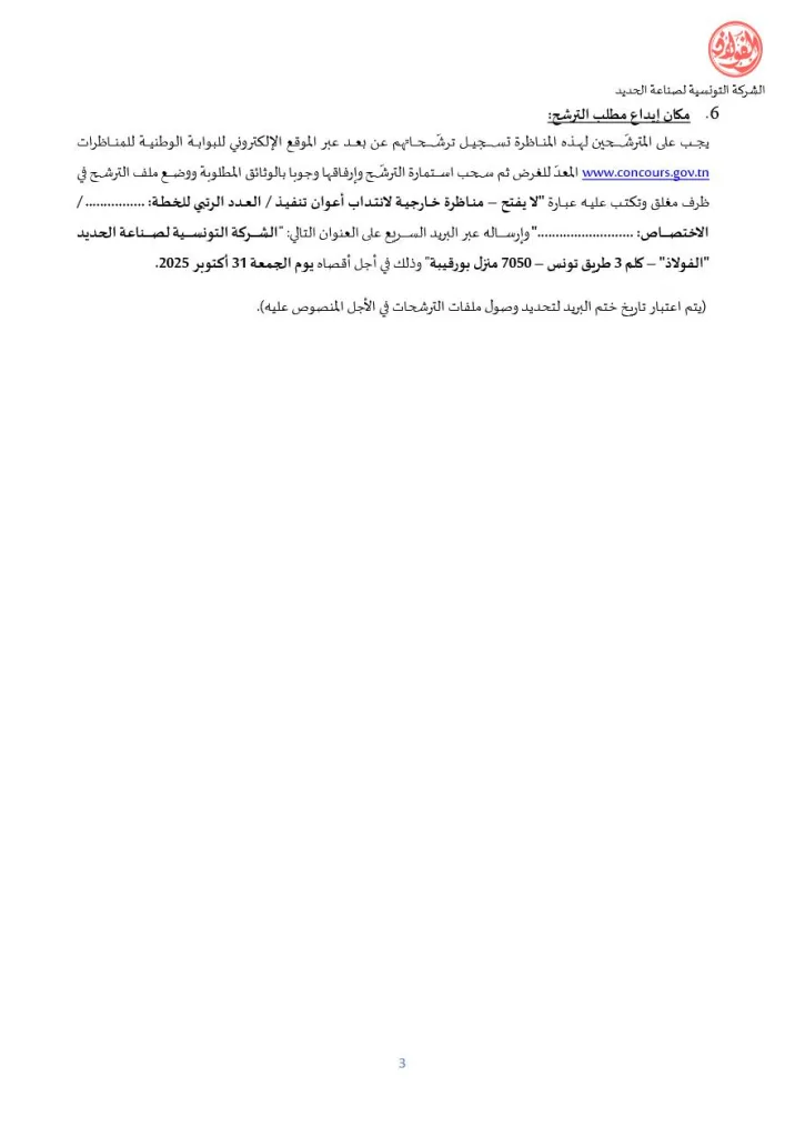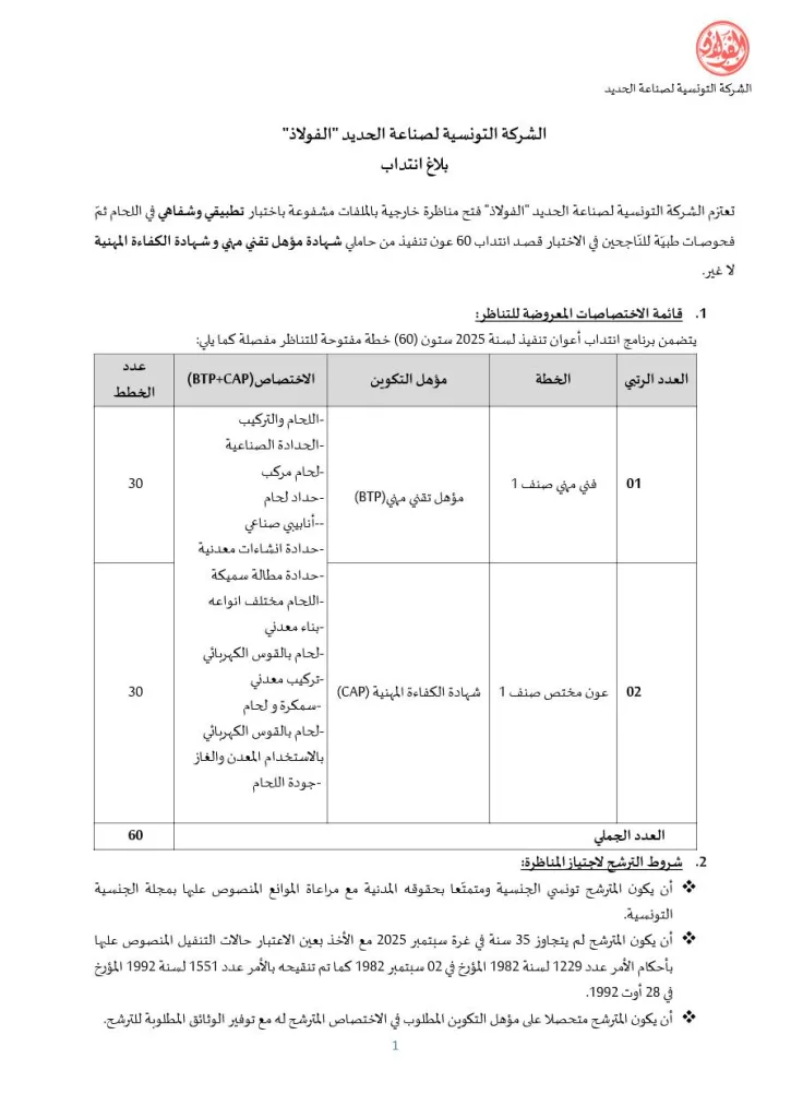 الشركة التونسبة لصناعة الحديد الفولاذ | إنتداب فني مهني صنف 1 – مؤهل تقني مهني (BTP) – اللحام والتركيب أو الحدادة الصناعية أو لحام مركب أو حداد لحام أو أنابيبي صناعي أو حدادة انشاءات معدنية أو حدادة مطالة سميكة أو اللحام مختلف انواعه أو بناء معدني أو لحام بالقوس الكهربائي أو تركيب معدني أو سمكرة و لحام أو لحام بالقوس الكهربائي بالاستخدام المعدن والغاز أو جودة اللحام | 30 | 2025-10-31 | 2025-10-31 |