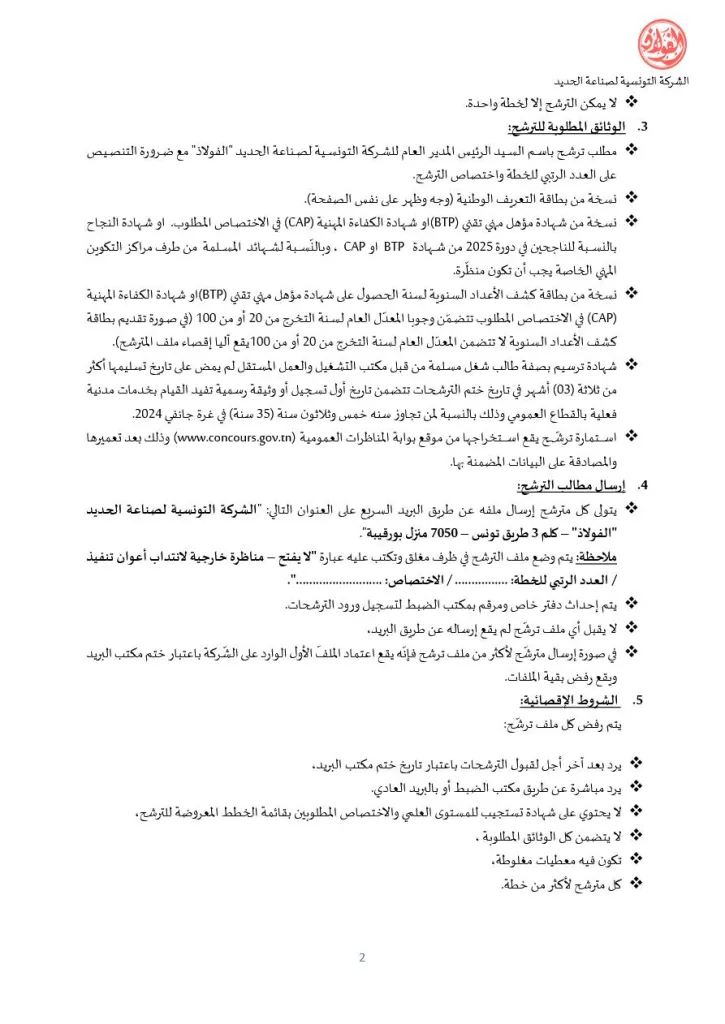 الشركة التونسبة لصناعة الحديد الفولاذ | إنتداب عون مختص صنف 1 – شهادة الكفاءة المهنية (CAP) – اللحام والتركيب أو الحدادة الصناعية أو لحام مركب أو حداد لحام أو أنابيبي صناعي أو حدادة انشاءات معدنية أو حدادة مطالة سميكة أو اللحام مختلف انواعه أو بناء معدني أو لحام بالقوس الكهربائي أو تركيب معدني أو سمكرة و لحام أو لحام بالقوس الكهربائي بالاستخدام المعدن والغاز أو جودة اللحام | 30 | 2025-10-31 | 2025-10-31 |
