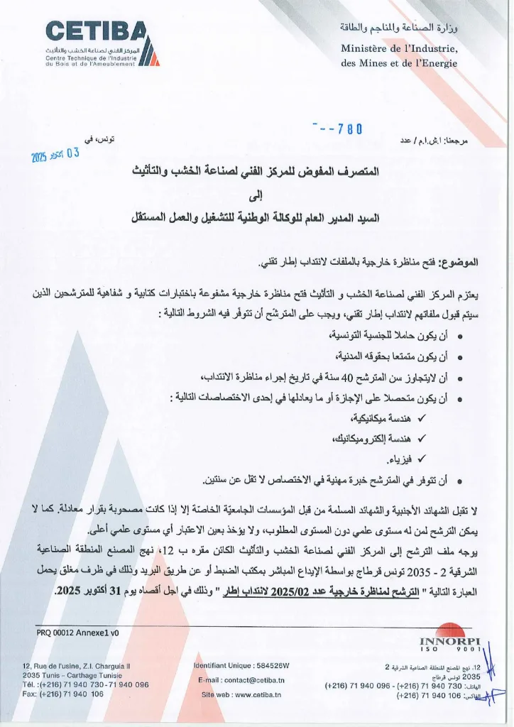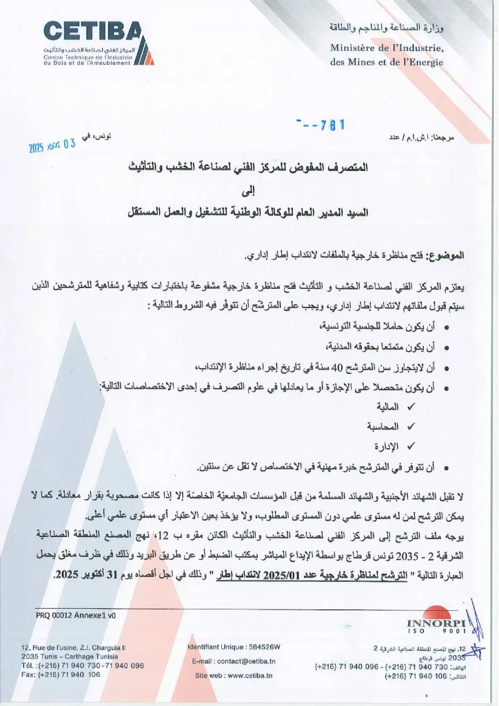 مناظرة المركز الفني لصناعة الخشب والتأثيث CETIBA للإنتداب : آخر أجل 31 أكتوبر 2025